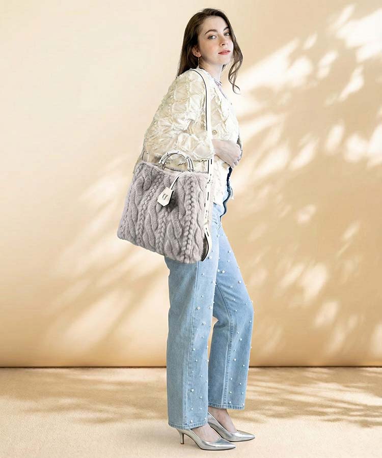 立体感のあるケーブル編みデザインと、ふわりと柔らかなファーが調和し、まるで彫刻のように美しいフォルムを実現しました。